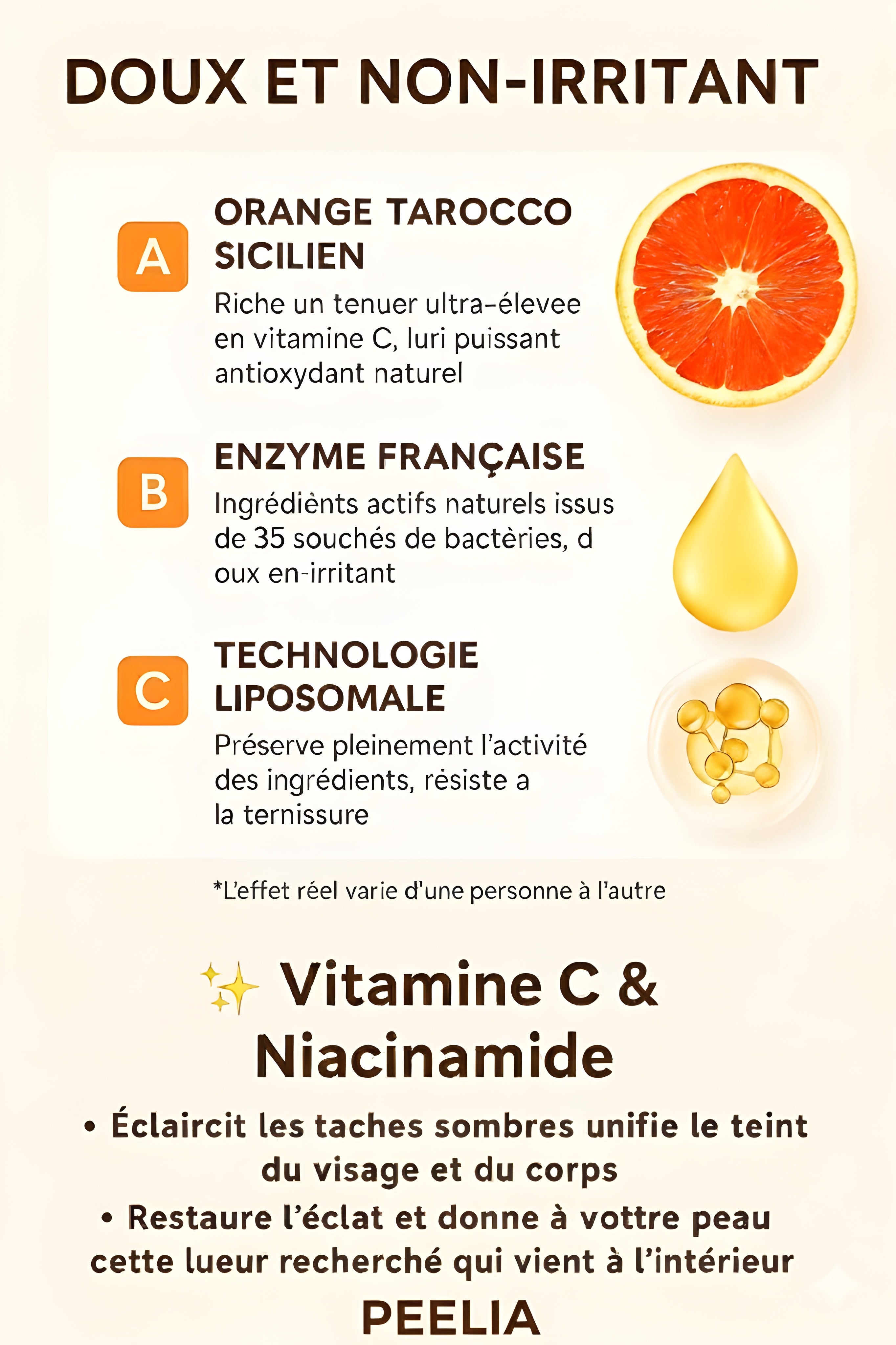 | Ingrédients naturels à base de vitamine C et d’orange | check_circle | cancel |